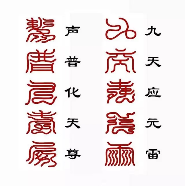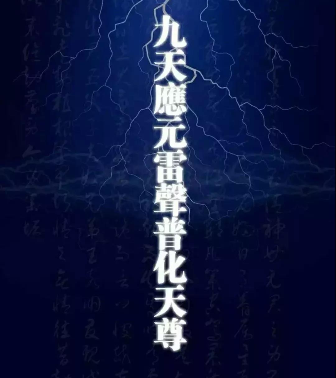 九天应元府,無上玉清王。化形而满十方,谈道而趺九凤。三十六天之上,阅宝笈,考琼书。千五百劫之先,位正真,权大化。手举金光如意,宣说玉枢宝经。不顺化作微尘,发号疾如风火。以清静心而弘大愿,以智慧力而伏诸魔。总司五雷,运心三界。群生父,万灵师。大圣大慈,至皇至道。九天应元雷声普化天尊。